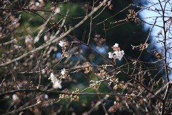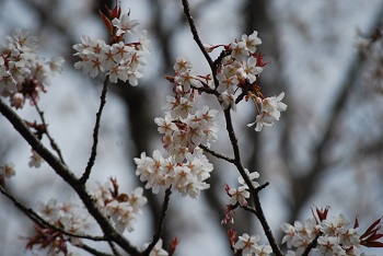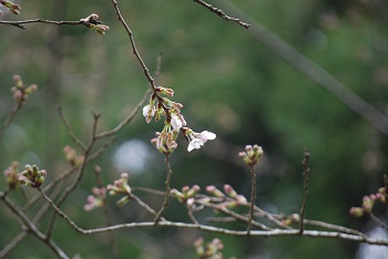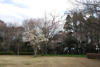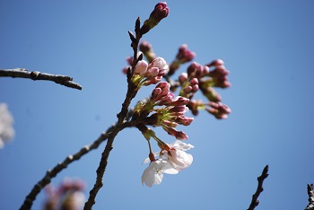 太陽の広場の東側のサイクリングコース脇では、ヤマザクラが数本点在して開花しています。(モクレンの後ろがヤマザクラです)お花見広場全体では、ソメイヨシはピンク色の蕾の状態ですがトイレ奥脇の1本だけですが、数輪のソメイヨシノの開花が確認出来ました。明日から気温が高くなる予報ですので開花のスピードが上がるのではないでしょうか・・・