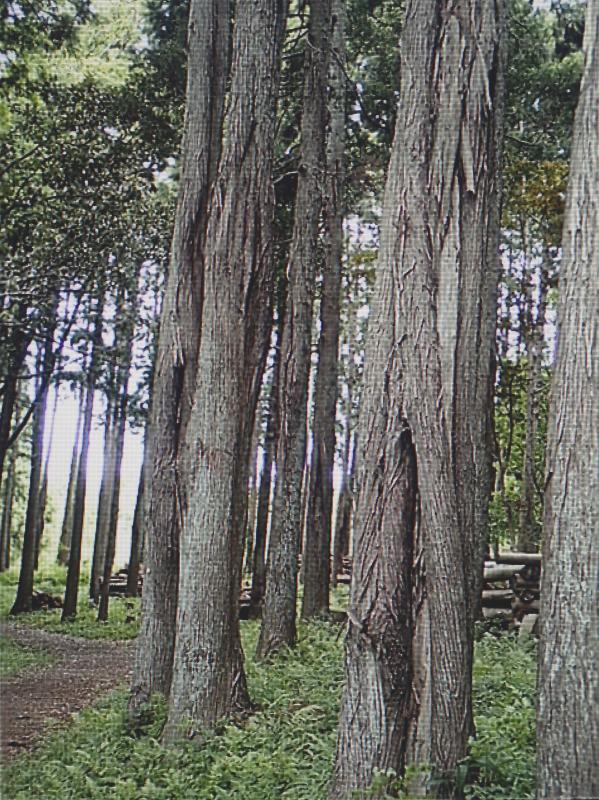 スギ林の中に入るとひんやり。 林の外より気温が1℃低くなっていました。 |