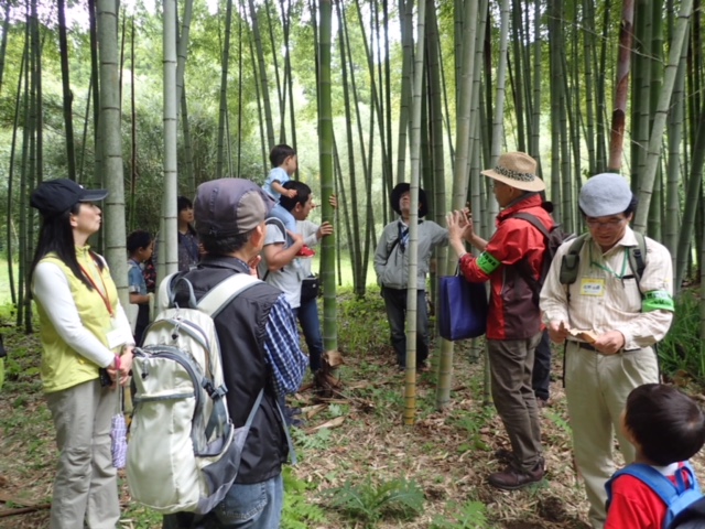 竹林の中で、竹のひみつについて説明。 小さなタケノコがわずか数日で背高のっぽの竹に成長。 |