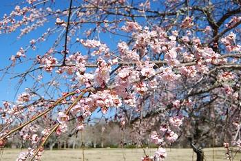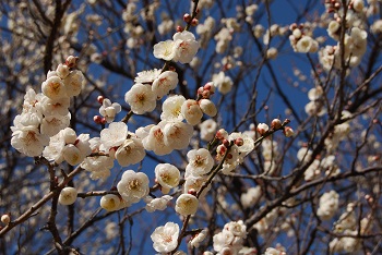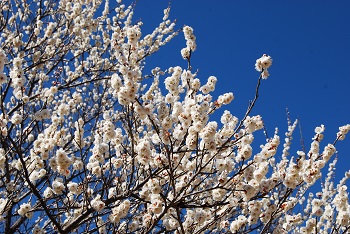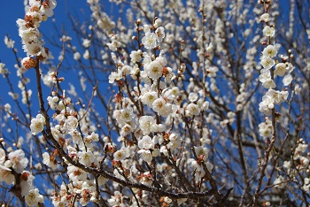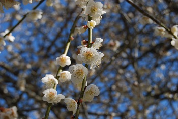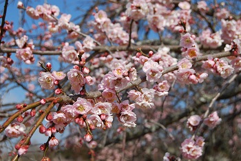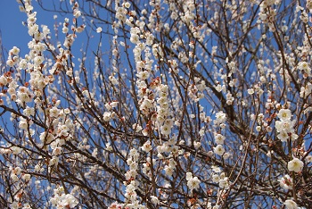 昨日の雨により早咲きの梅は一部見頃が過ぎてしまいましたが全体では、見頃後半となっています。今日は、青空の元、鶯の鳴き声が梅林に響き、梅の香りも漂い癒されました。シダレ(白)は見頃となり、シダレ(ピンク)は7分咲程になりました。お早目のご鑑賞をお勧め致します。