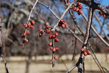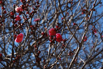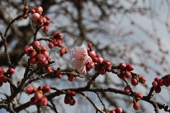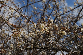 梅林では、紅梅がピンクの花を咲かせ始めましたが全体での開花は、まだわずかです。白梅は、ほとんどが固い蕾ですが、中には膨らんだ蕾もあり数輪開花しているものもありました。昨年の見頃は、2月中旬から3月上旬まででした。見頃になるまで暫く時間がかかりそうです。