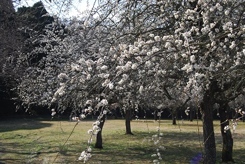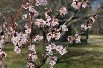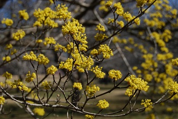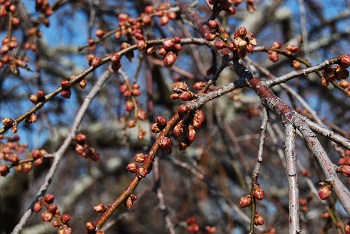 早咲きの梅は一部色あせ散り始めてきており見頃後半となっていますのでお早目のご鑑賞をお勧めいたします。シダレ(白)は、開花が進み見頃となっています。シダレ(ピンク)は、大きく膨らんできている蕾も増え開花も進んできました。梅林の中にあるサンシュユも見頃となっています。