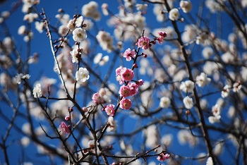 全体では、5分咲きほどの開花です。昨日の強風で多少は散っていましたが、早咲きの紅白の梅は見頃となりました。遅咲き、シダレの梅はまだ、硬い蕾の状態でした。