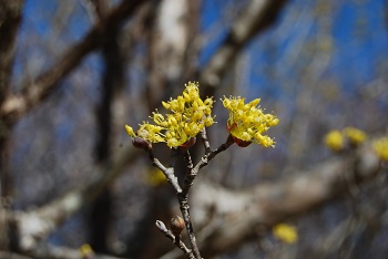 梅林では遅咲きの梅やシダレ(白)(ピンク)が見頃後半となり、早咲きの梅は、見頃が過ぎてしまいました。サンシュユは、開花が進み黄色が目立ってきています。