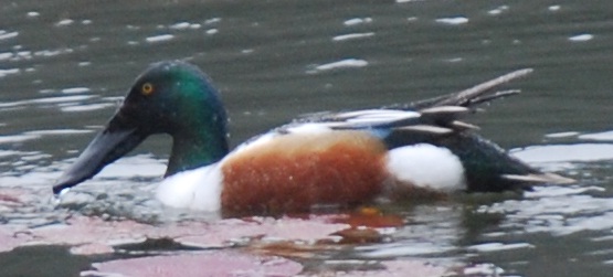 ハシビロガモ(冬)★★★ 大きな平たいクチバシが目立ち、オスは、胸が白く脇は栗褐色