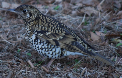 トラツグミ(留・漂)★★★ 黒褐色のウロコ模様に覆われて体は、黄褐色、腹が白く