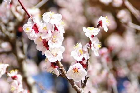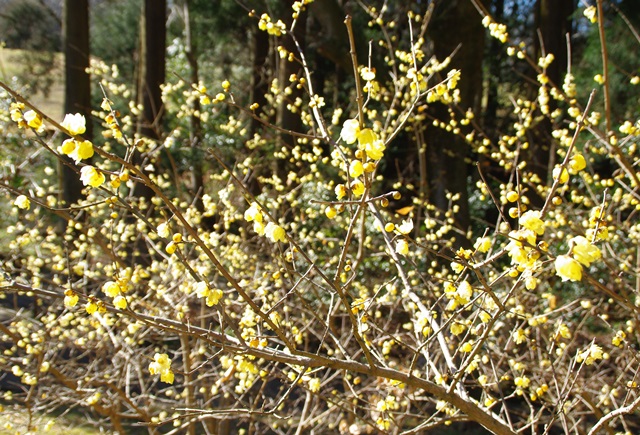 梅林(約10,000平方メートル)では、ウメを5種約60本、ロウバイ50本を栽培しています。1月から2月にロウバイの黄色の花、2月から3月にウメの白色、紅色、桃色などの花が咲きかぐわしい香りを漂わせます。
