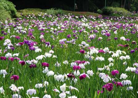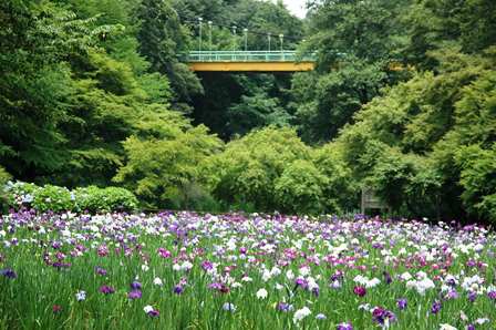 泉自然公園の菖蒲田泉自然公園の菖蒲田(2,700平方メートル)では、約6,000株、約12品種のハナショウブ(花菖蒲)を栽培しています。5月下旬から咲きはじめ6月中旬頃に見ごろを迎えます。梅雨空に映える紫や白など色とりどりのハナショウブを鑑賞できます。また、菖蒲田の周囲ではアジサイの花も見られます。