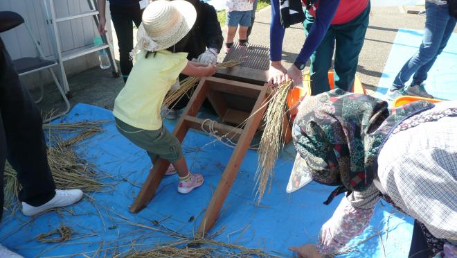 第6回の活動内容は、中止となった第5回に実施する予定だった『脱穀』と、当初の予定通り『籾摺り』を併せて行いました。