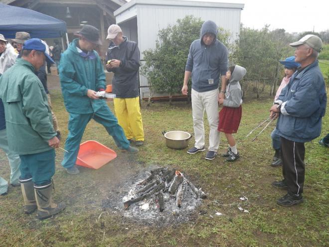 4.途中から雨も上がり、屋外で焼き芋をしました。鮮やかな黄色に焼きあがったサツマイモを、皆さん息を吹きかけて冷ましながら、ちょっとずつ頬張っていました。