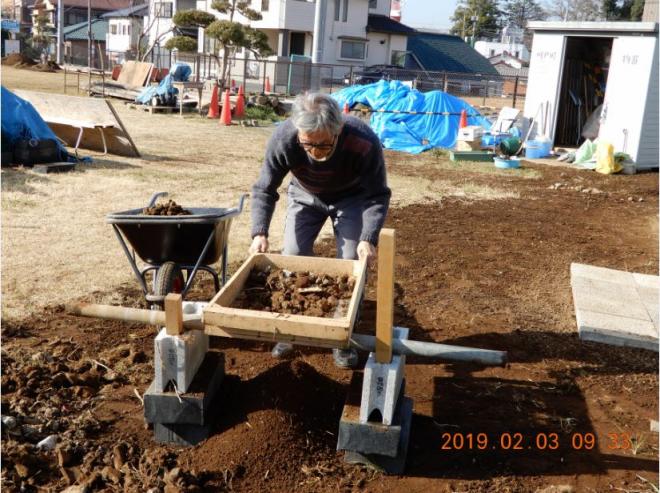 地面にはたくさんの石がありました。少し掘るだけでコンクリートガラ(瓦礫)も出る状態であり、将来、子供たちが駆け回ることを考えると対応が必要でした。そこで、ガラと土をふるい分け、除去していきます。
