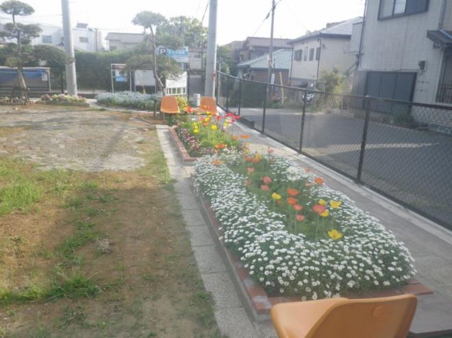 鮮やかな花々が咲き誇る花壇です。デージーやノースポール等が美しく、通りからもよく見えます。花壇を一年中 華やかにするために、苗床も整備されました。