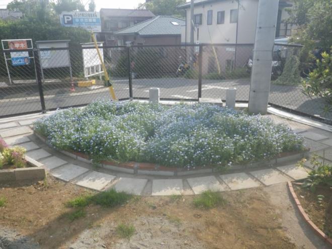 公園の奥にある花壇は、ネモフィラの青が鮮やかです。