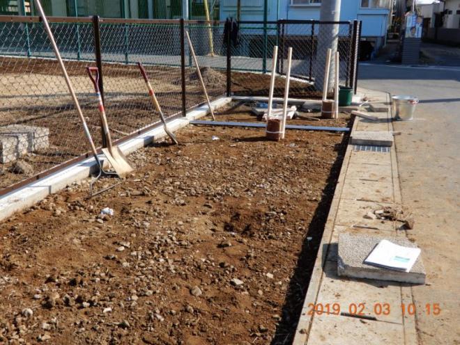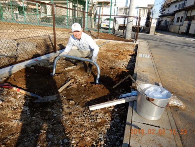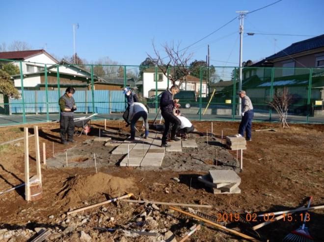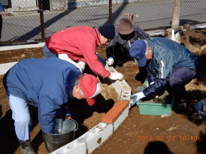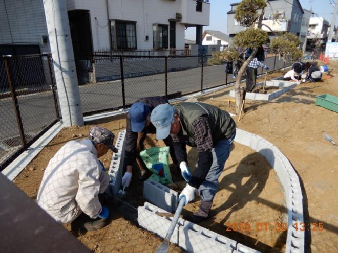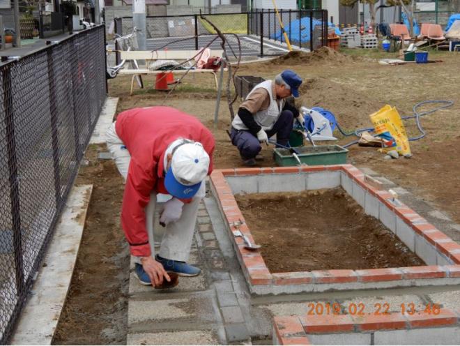 花壇の枠を固め、レンガで意匠を施していきます。寒さにも負けず、整備がどんどん進んでいきます。