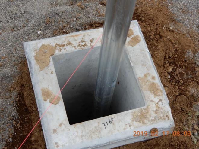 地中に埋め込んだコンクリート製の基礎に鉄のパイプを打ち込み、モルタルで固めていきます。
