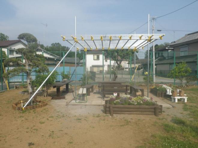 日陰だなの周りには、丸太の花壇やテーブル、ベンチ等も設置されました。