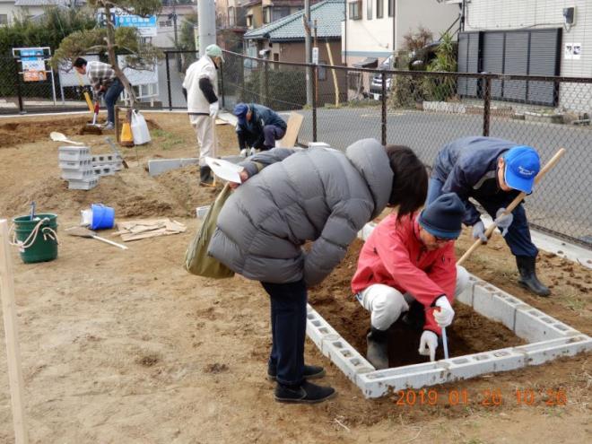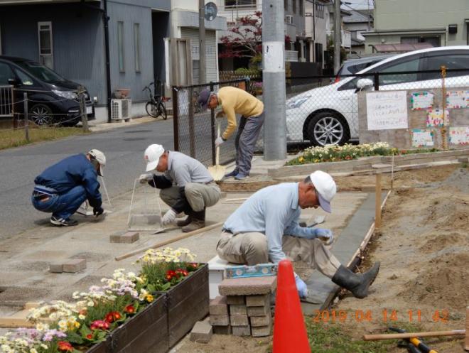 花壇の枠組を作り、その後、土の搬入、花苗を植え付けます。グループの皆さんで協力し、枠組みがどんどん出来上がっていきます。