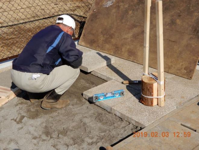 日陰だなの位置と範囲を決めます。転圧した後に、平板ブロックを敷いていきます。