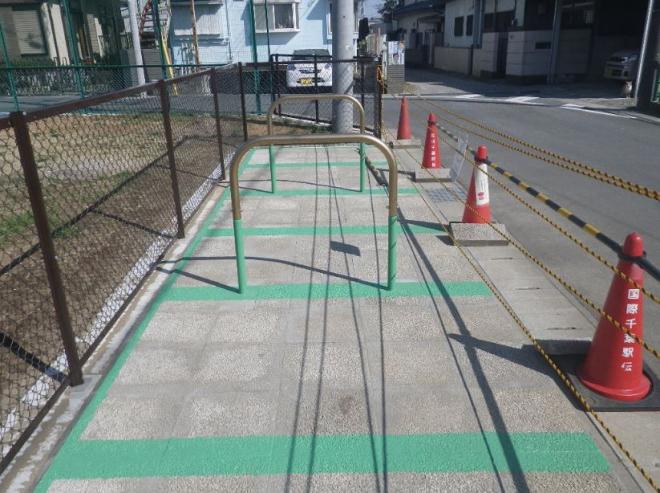 自転車の倒れ防止パイプの位置を確認し、平板を並べて間隔を調整しています。