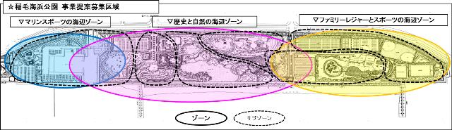 稲毛海浜公園(都市公園)の各ゾーンにおいて、民間の事業者が自己の資金で公園施設の新規整備または改修を行い、周辺を含めた一帯の区域において魅力的な運営と適正な維持管理を行う事業の提案を募集します。