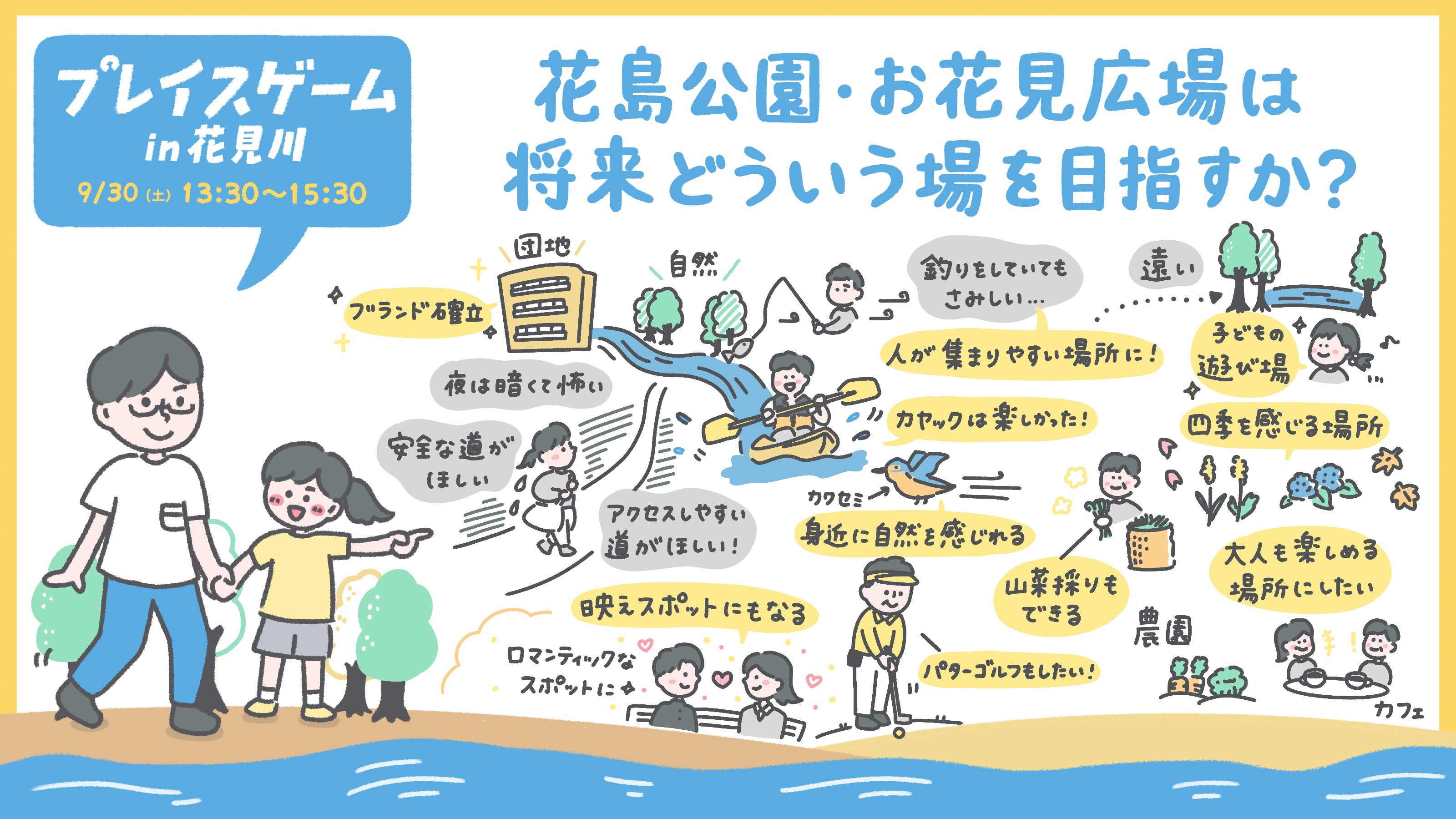 本ワークショップでは、3つのテーマについて実際にまちあるきを行い各場所の課題と可能性、新しいアイデアをグループに分かれて考え、発表しました。これらを踏まえ、今後の花見川の利活用に向けた長期・短期アクションを検討していきます。また、本ワークショップで出た意見をもとに10月・11月に花島公園お花見広場で社会実験を実施いたします!