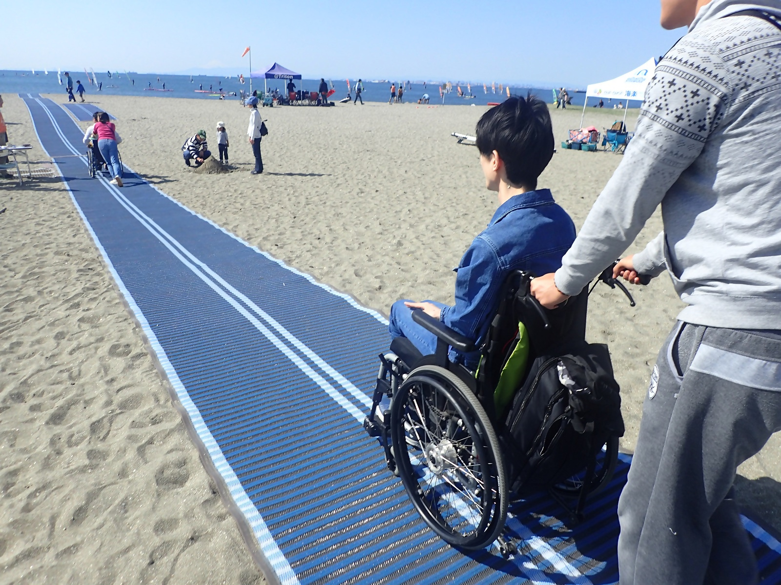 砂浜に敷くことで車いすやベビーカーでもタイヤが埋もれず、楽に移動ができる特殊なマット「モビマット」をぜひ体験しに来てください!