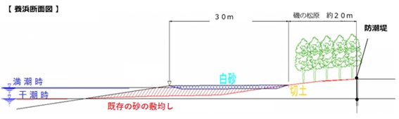 | 白砂敷均し | 満潮時でも海面にならない範囲の砂浜の表層に約25,000立方メートルの白砂を敷均し。(全長1,200m×幅30m×厚さ0.7m) |