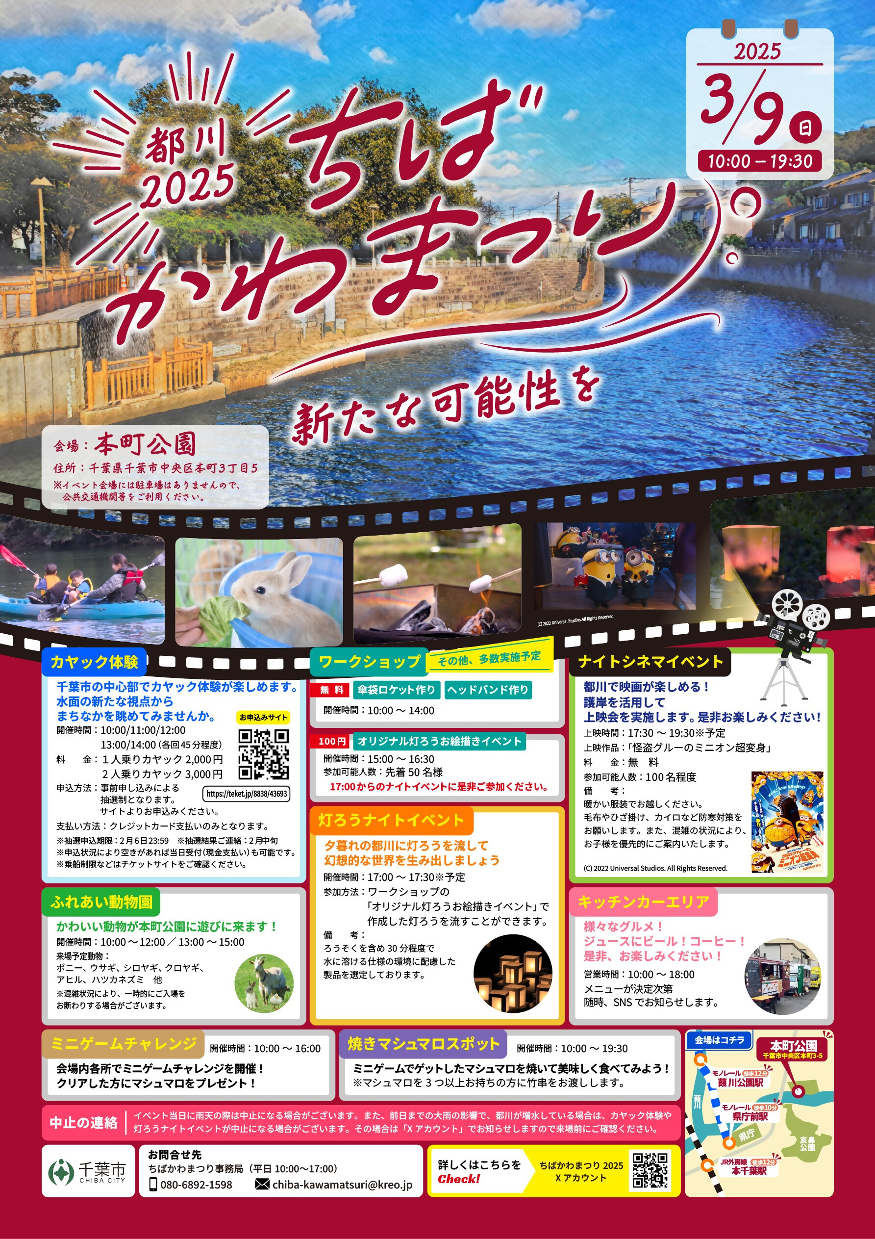 市内の主要な3河川である都川、花見川、鹿島川の魅力を発信する「ちばかわまつり2025」として、都川では親水空間を活用したカヤック体験やナイトシネマイベント等を開催します。