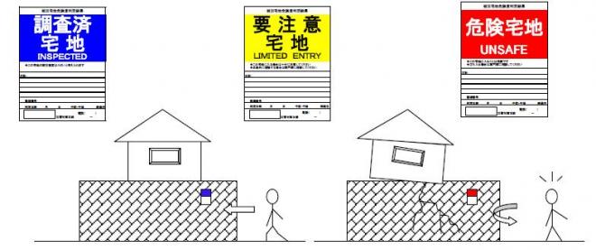 大規模な地震や大雨等によって、宅地が大規模かつ広範囲に被災した場合、要請を受けた被災宅地危険度判定士(以下、「宅地判定士」)が危険度判定を実施し、被害の発生状況を迅速かつ的確に把握することにより、宅地の二次災害を軽減・防止し、住民の安全を確保することを目的としています。宅地判定士を含む3人が1組になって、調査票等の客観的な基準により被害状況を調査し、その結果をもとに危険度を判定します。被災宅地危険度判定の結果は、下記の3種類の判定ステッカーを見えやすい場所に表示し、当該宅地の使用者・居住者だけでなく、宅地の付近を通行する歩行者にも安全であるか否かを識別できるようにします。また、判定ステッカーには、判定結果に基づく対処方法についての簡単な説明や、二次災害防止のための処置についても明示します。