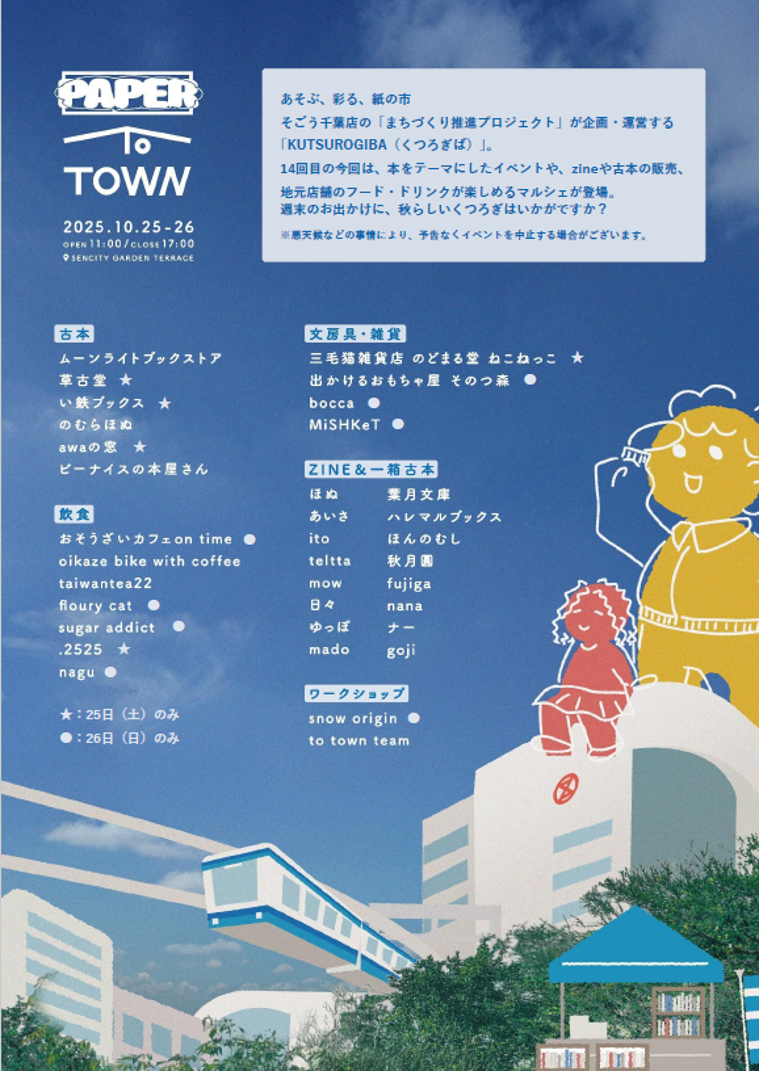 2025年10月25日土曜日と26日日曜日開催予定のKUTSUROGIBA「PAPER To TOWN」は両日ともに悪天候が予想されるため、開催を中止することと致しました。