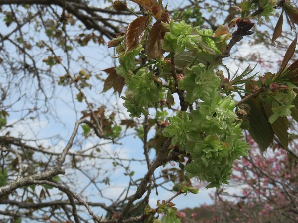 また駐車場から耕園に向かう道には、なかなか目にすることのない「緑色の桜」も咲いています。