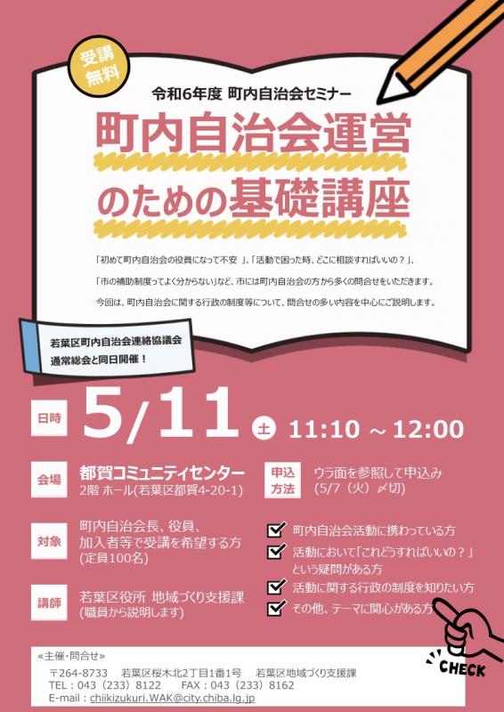 | 対象者 | 若葉区内の町内自治会 会長・役員・会員等の皆様(定員100名、事前申込制) |