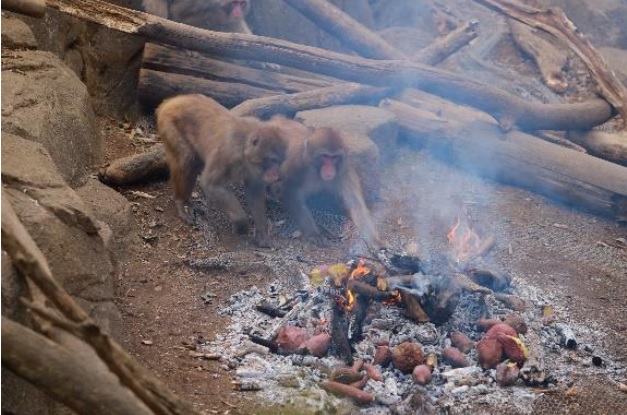 ホンドザル展示場のサル山の中でたき火を行い、焼き芋をつくっておサルさんたちに提供します。