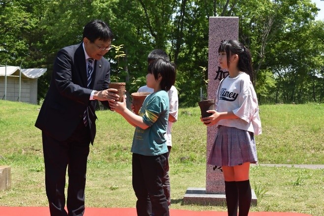 式典では、桜木小学校の皆さんから竪穴式住居の建築材として使われているクリの苗木が市長に授与されました。