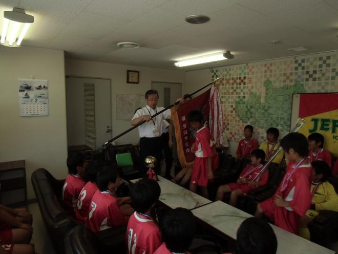 18人の選手と監督・コーチの方々が、優勝旗、優勝カップを持参し優勝報告をしてくださいました。