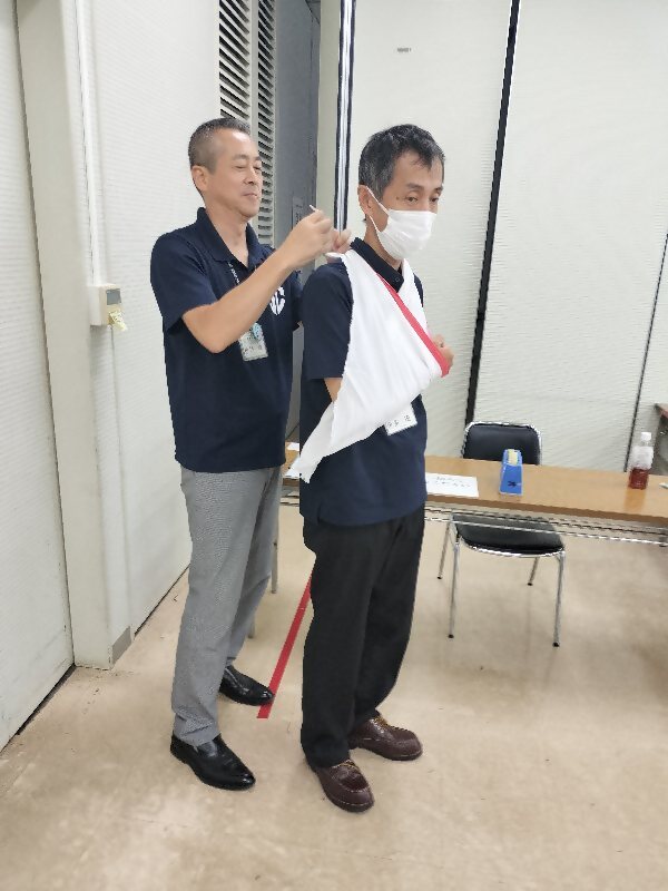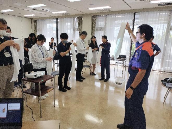 三角巾の使い方に苦慮している職員も見受けられましたが、三角巾一つで止血や固定ができることを再認識しました。併せて、担架では実際に人を乗せての運搬方法を学び、担架の実用性について体感しました。