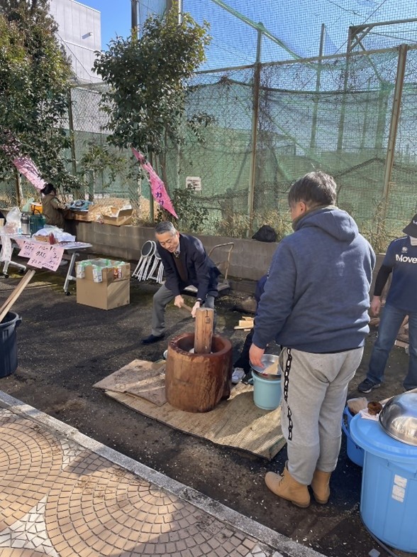 当日は、屋外で本格的な「臼と杵」を使った餅つきが行われ、私も何十年ぶりかの餅つきをさせていただきました。このほか屋外では、焼き鳥、焼きそばなどが子供たちが購入しやすい金額で販売され、すごく賑わっていました。