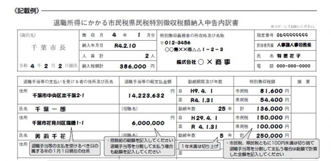 それ以外の役職の場合は、「退職所得にかかる市民税県民税特別徴収税額納入内訳書」の退職後1ヵ月以内の提出をお願いいたします。なお、同様の内容が確認できる「退職所得の源泉徴収票・特別徴収票」などの提出でも問題ありません。