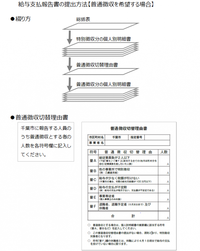 また、給与支払報告書総括表に記載の普通徴収該当人数と一致するよう『普通徴収切替理由書』に切替理由に基づく人数を記入して提出してください。