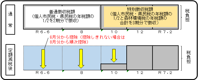 ※令和6年度から年金特別徴収が開始される方は個人市民税・県民税の年税額の2分の1を普通徴収(第1期及び第2期)、個人市民税・県民税の年税額の2分の1の額と森林環境税の年税額の全額の合計額を令和6年10月、12月、令和7年2月から徴収します。