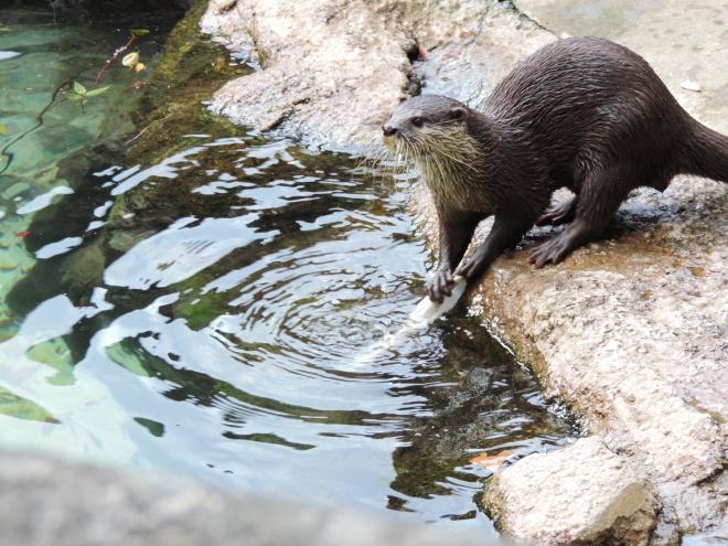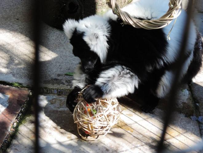 すぐにエサを食べ終わり常同行動に繋がってしまうアカハナグマの為に、採食時間を延ばすための工夫としてラタンボールを参加者に作成してもらいました。置く、吊り下げるなど空間を利用しながら嗅覚でも発見できる場所に設置し、ハナグマが時間をかけてエサを食べる様子まで観察してもらいました。