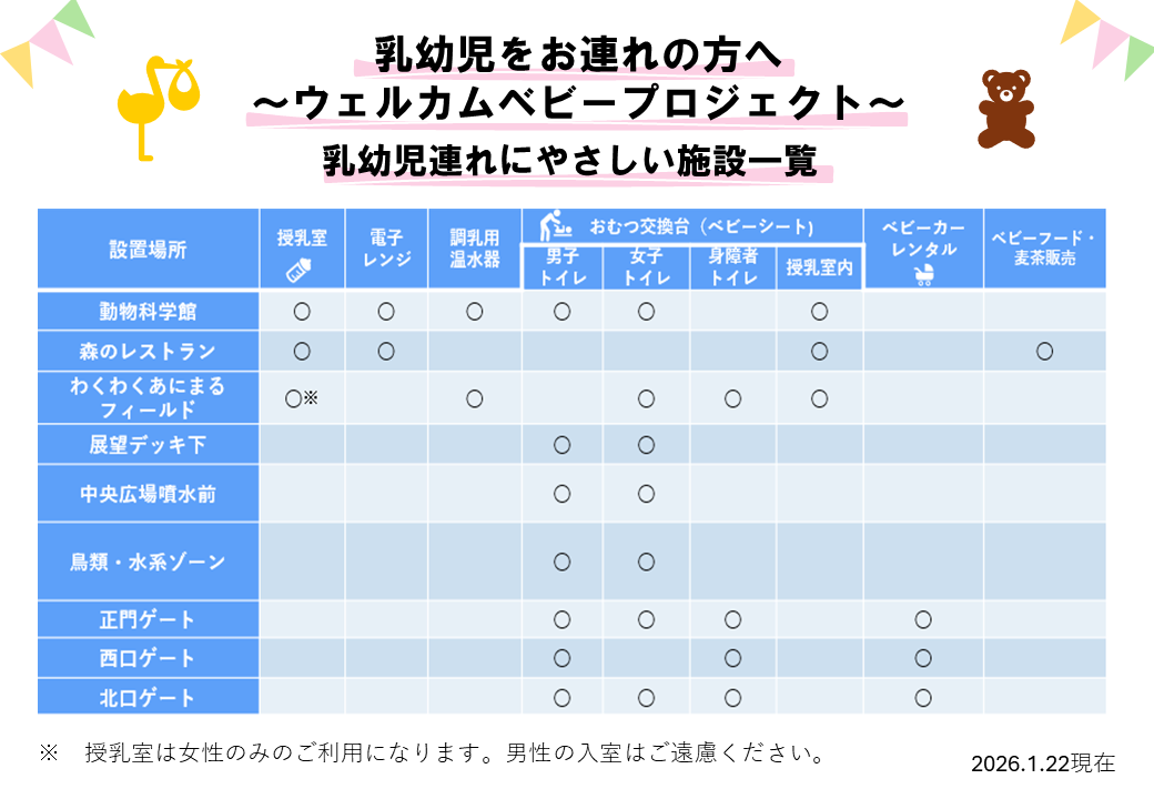 千葉市動物公園では、乳幼児をお連れの方に安心して、ゆっくり園内を楽しんでいただけるよう施設の充実に努めています。