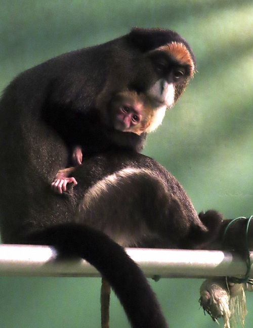 ブラッザグェノンは、アフリカ中央部の森林や沼地林に住み、「世界で一番美しいサルの1種」と言われ、体全体は緑灰色系ですが、手足と尾は黒く、尻は白、太ももには白いストライプ。そしてなんといっても額の三日月型の頭巾をつけたかのようなオレンジ色模様と、吻(口先)の長い白いあごひげが特徴的で、「水戸黄門」様に似ている個性的な顔つきから、俗に「黄門ザル」とか呼ばれたりもしています。オスはさらにある部分が青色なんですよ。展示場で青色を探してみてください。オナガザル科に属する彼らの学名(Cercopithecus neglectus)には「注目されない」という意味の”neglectus”と言うことばが含まれています。それは、じっと身を潜める習性があり、時にそれが5時間にも及ぶことが知られていることに由来しています。大きな声を出すことは稀で、むしろ警戒や威嚇には「見つめる・歯を唇で隠したままで口を開ける・頭を振る」などのしぐさでコミュニケーションを取るようです。毛づくろいが大切なのは他の霊長類と同じですが、匂いにも敏感で、仲間の口の匂いを嗅ぐことで”食べられるもの”を学びあうとも言われています。またブラッザグェノンとは、アフリカを探検した19世紀後半のイタリア人探検家サボルニアン・ド・ブラッザ(Savorgnan di Brazza)の名前に由来しており、グエノンはイタリア語で「かわいい男の子」という意味があるようです。また全体にずんぐりとした体形からするとこれも意外かもしれませんが、泳ぎが得意で「沼地ザル(swamp monkey」と言う別名もあります。さて、昨年5月に日本平動物園から当園にやって来てくれたオスの「ユッケ」(2016年8月16日生まれ)と上野動物園からやって来てくれたメスの「マドカ」(2013年4月5日生まれ)との間に生まれた赤ちゃん(性別はまだ不明です)は、親とはまだ全く異なる顔立ちと様相をしています。そんな今しか見れないブラッザグェノンの赤ちゃんの姿を見逃しなく!