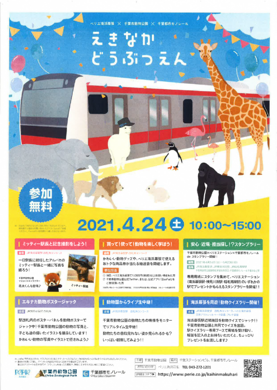 2件目はペリエ海浜幕張様・千葉都市モノレール様とのコラボ「えきなかどうぶつえん」です。幕張インターナショナルスクールの児童の皆さんに描いて頂いた当園の動物たちの絵や写真等で海浜幕張駅をジャックし、ここでもアルパカ「ミッティー」が一日駅長に就任します。先着でプレゼントがもらえるスタンプラリーなどもありますよ。また両イベントとも当園からのライブ中継で動物公園の「今」をお届けします。お楽しみに!