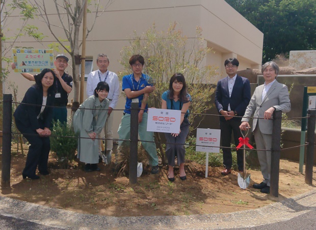 当園との連携取り組み‶AIを活用した動物生態の視える化“に加え、これまでも様々なご支援を頂いている(株)ソード様から、葉先が赤色になり、初夏には小さな羽毛状の白い花を咲かせる常緑低木「メラレウカ レッドジェム」他3点(ブロンズランバー・カレックス・ウエストリンギア)が寄贈され、6月3日(木)にチーター展示場右際で植樹式を行いました。末永くこのエリアのシンボルツリーとなってくれると思います。ありがとうございました!