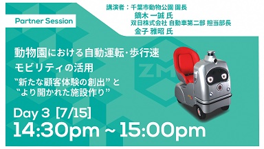 1つ目は、株式会社ZMP様主催『ZMP World 2021』です。「新たなZOOトリップ」と「より開かれた施設」の構築を目指ざす同社との取り組みは、昨年緊急事態宣言下で臨時休園中の5月に実施した「オンライン動物園」に始まり、今年6月3日~8日に実施(4日・6日は雨天中止)した自動走行体験イベントで3回目となりました。 昨年同様、これまでの取り組みについて7月15日のオンラインセミナーでご紹介させて頂く事になり、今回は事業化検討パートナーである双日(株)様とともに担当させて頂きます。参加無料のセミナーですのでどうぞご視聴ください。