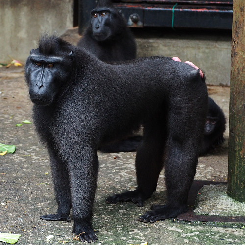 名前の通り、全身の体毛と顔の皮膚の色は黒色をしていますが、尻だこは鮮やかなピンク色をしています。また、頭冠部の毛が長く、後方へと突出していることも特徴的です。 |